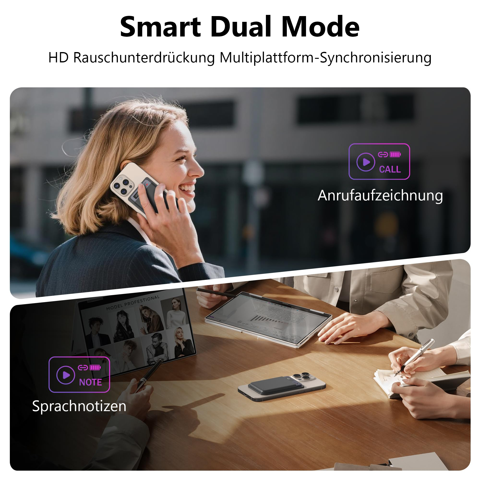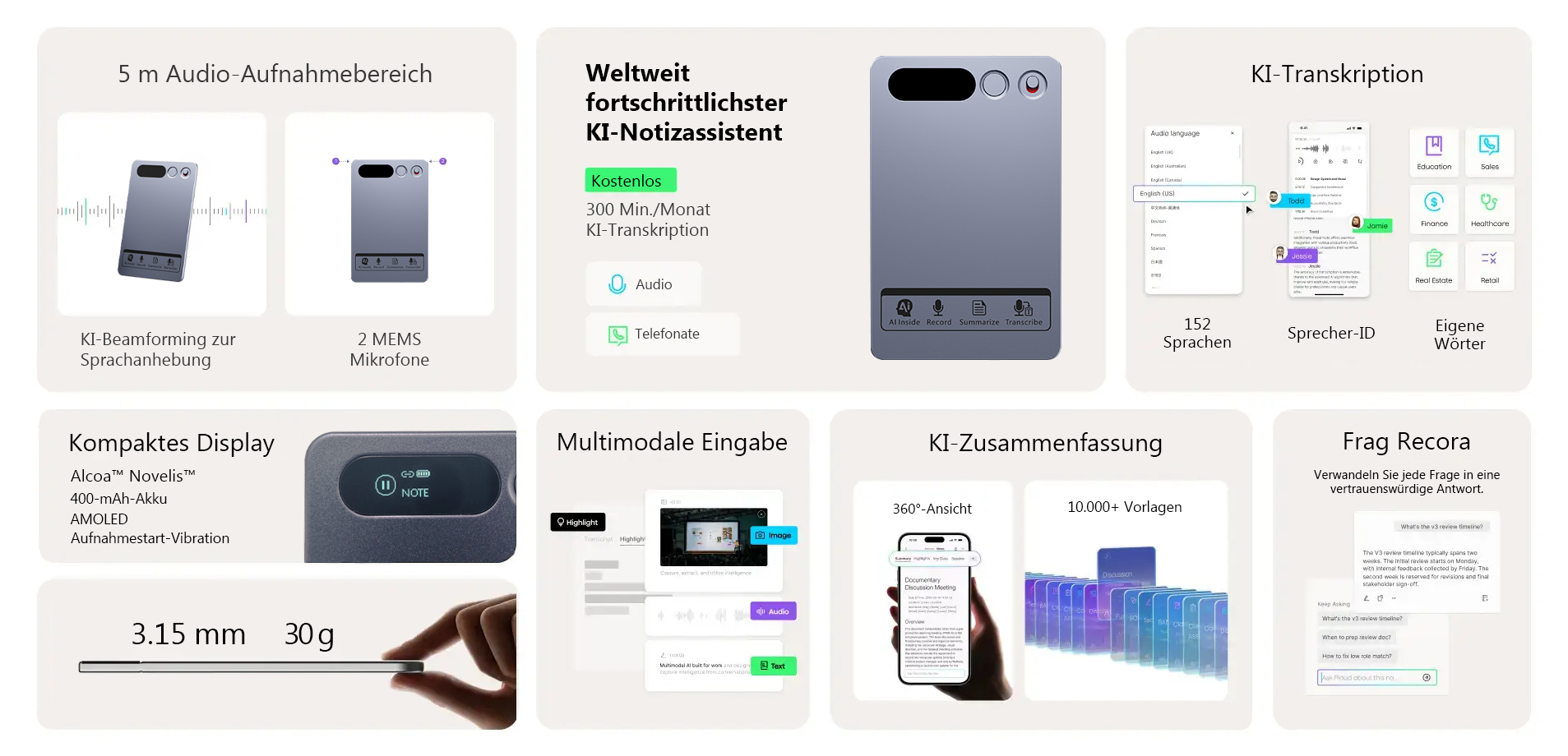 - Unterstützung für 118 Sprachen: Transkribieren Sie Besprechungen, Interviews und Vorlesungen über Bluetooth-5.4-Verbindung.
